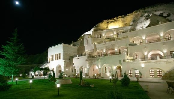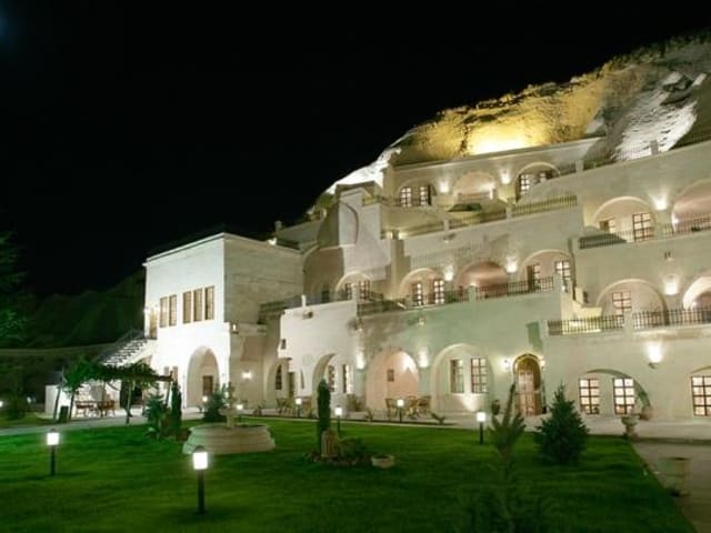 Das Alfina Cave Hotel in Ürgüp bietet luxuriöse Unterkünfte in einzigartigen Felsenzimmern, die mit traditionellen türkischen Motiven und einem Whirlpool ausgestattet sind. Die Lage des Hotels in der Nähe der beeindruckenden Felsformationen von Kappadokien und nur wenige Gehminuten von den Feenkaminen und dem historischen Türkischen Bad entfernt, macht es zu einem idealen Ausgangspunkt, um die Region zu erkunden. Das hoteleigene Restaurant bietet eine Vielzahl von türkischen und internationalen Gerichten sowie regionale Weine. Die freundlichen Mitarbeiter stehen Ihnen rund um die Uhr zur Verfügung, um Ihnen bei Fragen und Informationen über die Umgebung behilflich zu sein. Kostenfreie Parkplätze stehen Ihnen ebenfalls zur Verfügung.