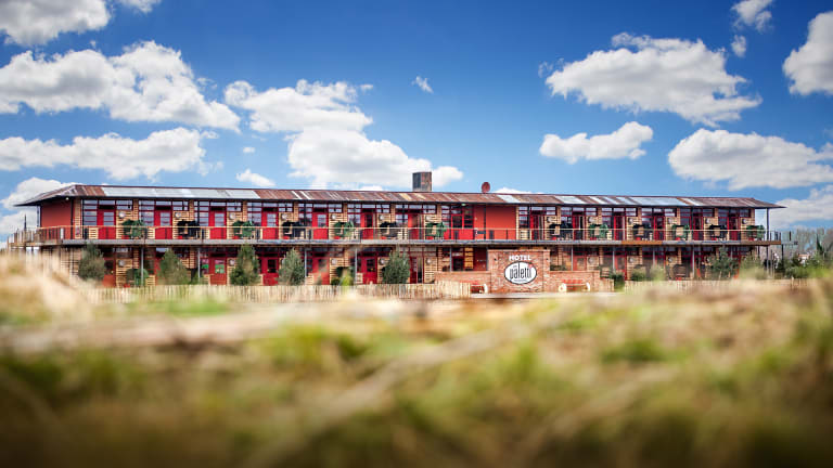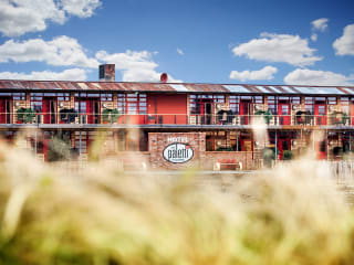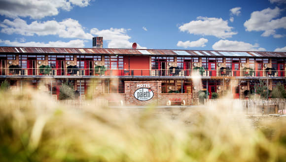 LAGE DES „ALLES PALETTI“ Besser geht’s nicht: Unser schickes Upcycling-Hotel ALLES PALETTI liegt unmittelbar am Erlebnis-Dorf Rövershagen und hat einen direkten Zugang zum Erlebnis-Dorf. Ihr seid so nah dran am Geschehen, dass das Frühstück in der Hof-Küche fast als „Zimmerservice“ durchgeht. Den Weg zum Frühstück könnt ihr mit der Feldbahn fahren. Linkerhand vom Hotel habt ihr derweil einen phantastischen Ausblick auf das angrenzende Feld.