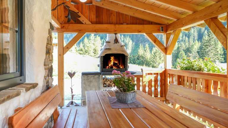 Im Almchalet Pöllatal können Sie Ihre eigenen Mahlzeiten in der voll ausgestatteten Küche zubereiten. Es gibt auch eine Terrasse, auf der Sie das Essen im Freien genießen können.