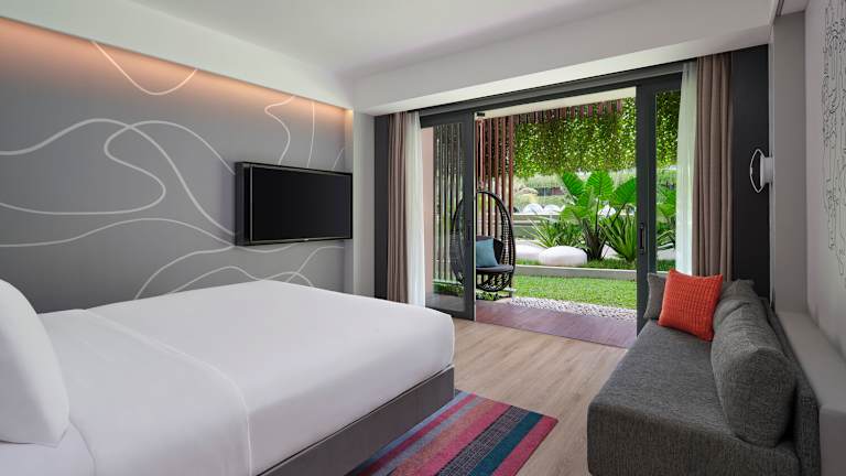 Alle 175 Zimmer sind clever gestaltet, mit modernen Annehmlichkeiten, technikfreundlicher Ausstattung und dem unverwechselbaren, farbenfrohen Aloft-Stil. Jedes Zimmer bietet einen 55-Zoll-Smart-TV, schnelles WLAN, bequeme Plattformbetten und Bäder mit begehbaren Duschen. • Aloft Room – Stilvoll und funktional, ideal für Arbeit und Freizeit. • Aloft Room, Poolblick – Genießen Sie den Blick auf den funkelnden Außenpool „Splash“ direkt vom Fenster. • Aloft Room, Gartenblick – Ein gemütlicher Rückzugsort mit erfrischendem Blick ins Grüne. • Aloft Room, Poolterrasse – Direkter Zugang zum Poolbereich von Ihrer privaten Terrasse. • Aloft Room, Gartenterrasse – Mit privater Terrasse und Schaukel, umgeben von tropischen Gärten.