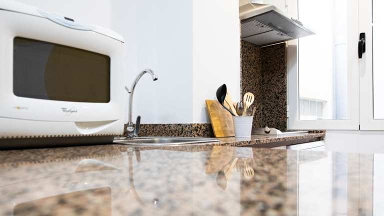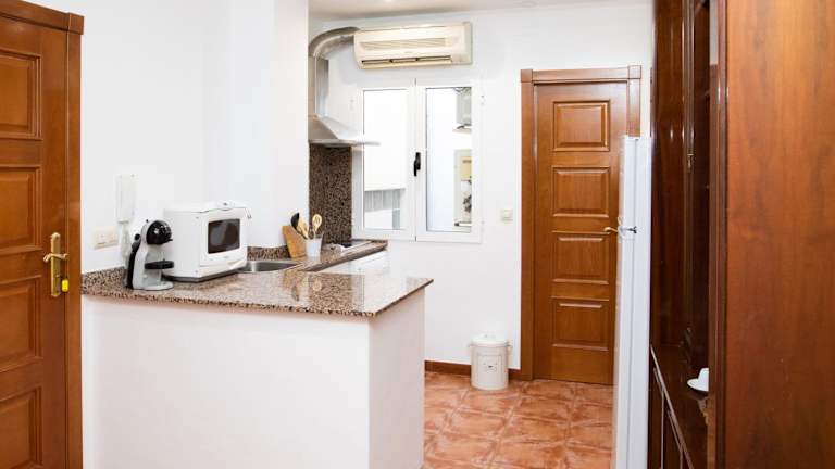 In jeder Wohneinheit ist eine voll ausgestattete Küche vorhanden, die über einen Kühlschrank, Geschirrspüler, Mikrowelle und eine Kaffeemaschine verfügt. Es gibt auch einen Esstisch für die Mahlzeiten.