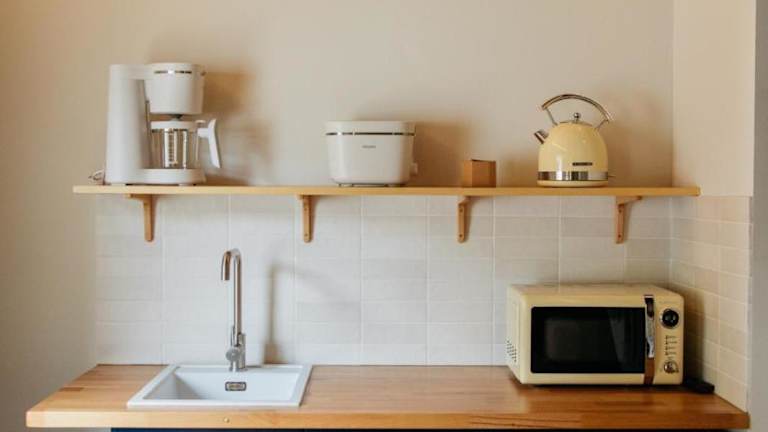 Die Unterkunft bietet eine voll ausgestattete Küchenzeile, die mit Kühlschrank, Mikrowelle, Kaffeemaschine, Wasserkocher und Toaster ausgestattet ist. Mahlzeiten können eigenständig zubereitet werden.