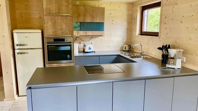 Die Chalets sind mit einer komplett ausgestatteten Küche ausgestattet, die unter anderem einen Kühlschrank, einen Geschirrspüler, einen Ofen und eine Herdplatte umfasst. Für die Zubereitung von Getränken stehen eine Kaffeemaschine und ein Wasserkocher zur Verfügung. Es sind keine weiteren gastronomischen Angebote beschrieben.