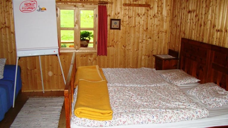 Stube/Küche im EG , ca 36m², kombinierter Koch- und Kachelofen, großem Holztisch. Seminarraum/Gruppenraum direkt von der Stube zugänglich. Ideal auch als Esszimmer und Aufenthaltsraum. Größe ca 36 m² , variable Gestaltungsmöglichkeiten (zb. Seminarbetrieb) 1 Schlafzimmer mit 8 Schlafplätzen (Stockbetten) im 1. Stock 1 Schlafzimmer mit 4 Schlafplätzen (Stockbetten) ebenfalls im 1 Stock. 1 Schlafzimmer im Eg (...das Separet) mit 2 Betten (erweiterbar auf 3) speziell für Trainer, Organisator... 2 Doppelzimmer (klein) 1 Einzelzimmer 1 Doppelzimmer (nur im Sommer Nutzbar) Stein- Keller, ca 12m² als Proviantraum Vorraum mit Garderobe Bad mit WC, Dusche und Waschbecken Tiefstadl/Lager für Holz, Sportgeräte. Holzterrasse Ost (ca 80m²) mit Holz- Brunnentrog Holzterrassen "West" und "Süd" Große Tenne im 1. Stock