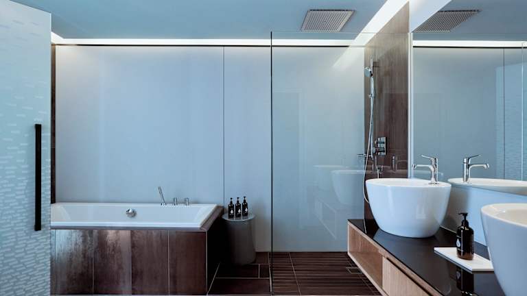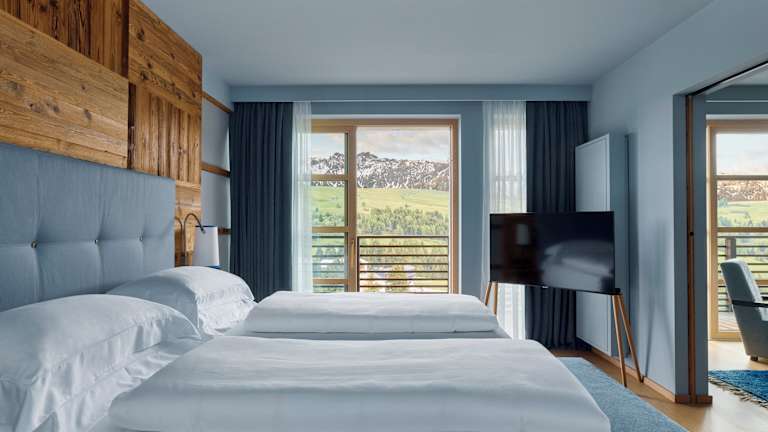 Die geräumigen Zimmer sind in warmen Farbtönen gestaltet und mit Holzfußböden ausgestattet. Jedes Zimmer verfügt über einen Flachbild-TV, eine Minibar, ein Badezimmer mit separater Dusche und Badewanne, sowie ein separates WC. Zudem bieten alle Zimmer einen Balkon oder eine Terrasse.