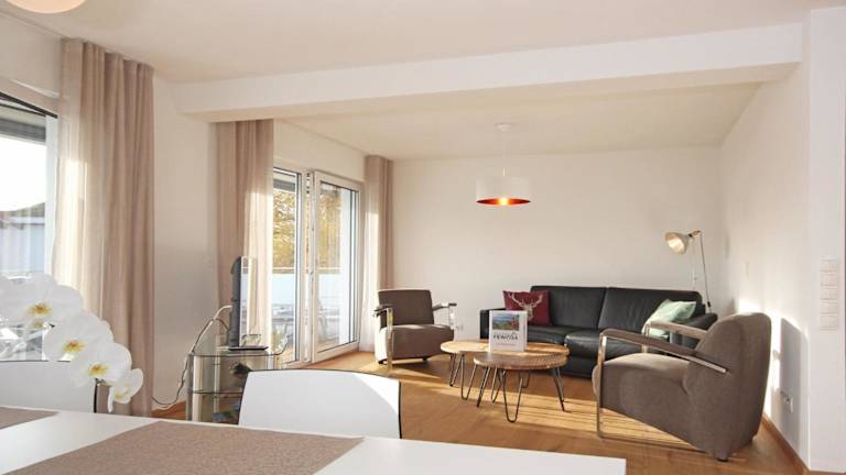 Die Ferienwohnung bietet zwei Schlafzimmer, ein Wohnzimmer mit einem Flachbild-TV sowie eine gut ausgestattete Küche mit Kühlschrank und Geschirrspüler. Das Badezimmer ist mit einer Dusche ausgestattet. Für zusätzlichen Komfort stehen gegen Aufpreis Handtücher und Bettwäsche bereit. Die Zimmer sind allergikerfreundlich gestaltet und es sind Nichtraucherzimmer verfügbar.