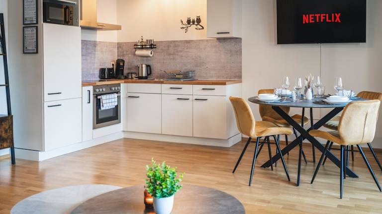 Es stehen verschiedene Verpflegungsmöglichkeiten zur Verfügung, darunter eine gut ausgestattete Küche in der Unterkunft. Darüber hinaus ist eine Essenslieferung in die Ferienwohnung möglich.