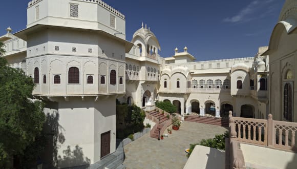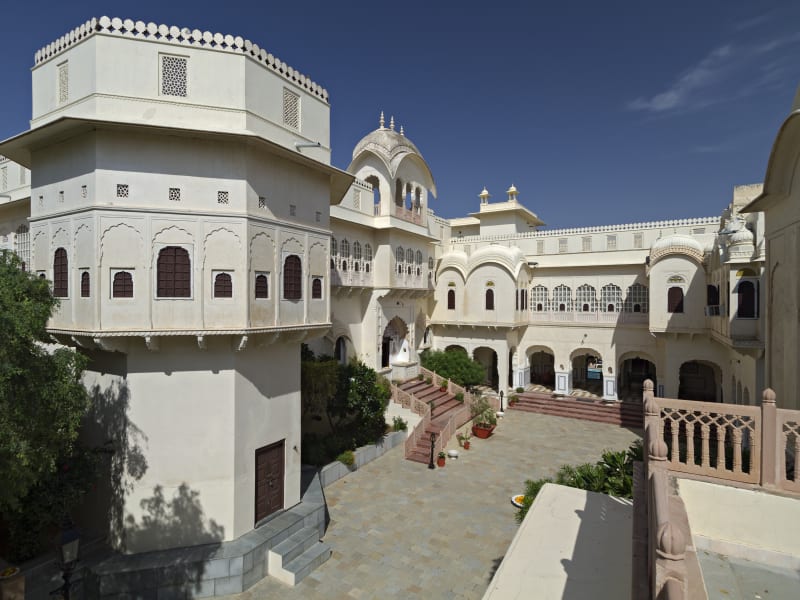 Alsisar Mahal ist der kampffeste Palast in der Stadt Alsisar in der Nähe von Shekhawati. Früher war Alsisar Mahal der Wohnsitz des Thakur von Alsisar, der kürzlich renoviert und in ein luxuriöses, denkmalgeschütztes Hotel umgebaut wurde. Alsisar, berühmt für Schlösser, Havelis und Cenotaphs, ist eine Kleinstadt, umgeben von halbtrockener Wüste, im Nordwesten des Stadtteils Jhunjhunu in Rajasthan. Sie entstand in Form einer kleinen Havelis-Sammlung in der Stadt und entwickelte sich später in Form einer riesigen Havelis, die heute hoch steht und eine Geschichte hinterlässt. Es gibt Hunderte von Havelis in dieser Gegend, die wunderbare Fresken in verschiedenen, immerwährenden Farben und Designs tragen. Jeder spricht mit voller Kehle über die glorreiche Vergangenheit von Shekhawati. Sie sind das vor Jahrhunderten geschaffene Meisterwerk der Kunst und Architektur. Deshalb ist das Land von Alsisar Mahal im Volksmund als offene Kunstgalerie bekannt.