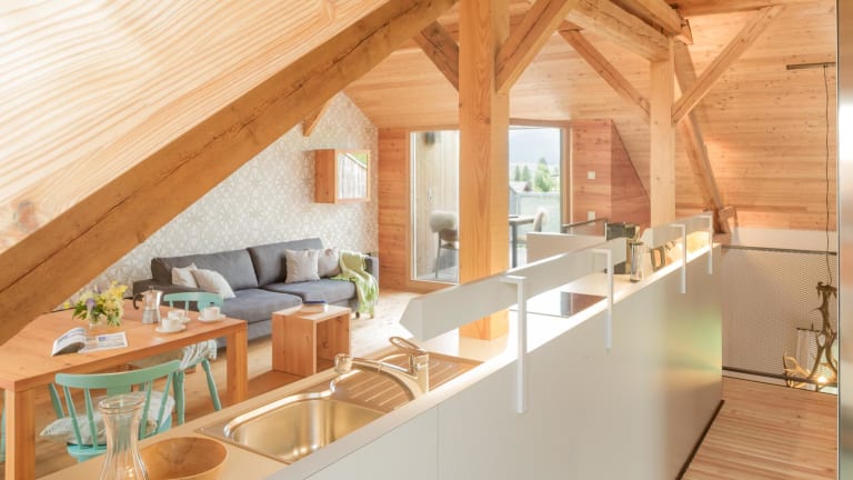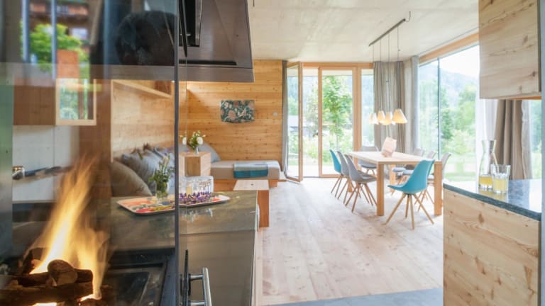 Ein altes Sägewerk am österreichischen Weissensee wurde umfassend renoviert und beherbergt nun vier hochwertige Ferienwohnungen. Holz ist hier immer noch zu finden, nun jedoch nicht mehr als Werkstoff, sondern an Wänden, Böden und Giebeln. Trotzdem wirkt es hier nicht zu rustikal, denn es herrscht modernes, gradliniges Design vor. Einige der Wohnungen bieten Loftfeeling und Blick in den offenen Giebelbereich sowie auskragende Liege- bzw. Sitzgelegenheiten über dem Mühlbach. Den Feriengästen steht ein Badeplatz am nur wenige Schritte entfernten See zur Verfügung, außerdem kann die “Badehütte Weissensee” gemietet werden. Dieses preisgekrönte Gebäude wurde vom Architekten der “Alten Säge” geplant. Es besteht ganz aus Lärchenholz und besticht durch seine zeitgemäße Architektur. Ein besonderes Erlebnis bietet der Weissensee im Winter: Von Mitte Dezember bis Anfang März ist er zugefroren und wird zu einer riesigen Eisbahn – Europas größten Natureisfläche. Hier kann man Schlittschuhlaufen, Eisstockschießen, Eishockey spielen oder einfach auf dem Eis spazieren gehen. Und nach einem Tag in der frischen Winterluft ist es in der “Alten Säge” besonders schön: Zum Aufwärmen geht es in die Sauna und danach kann man es sich auf dem Sofa am Kachelofen gemütlich machen.