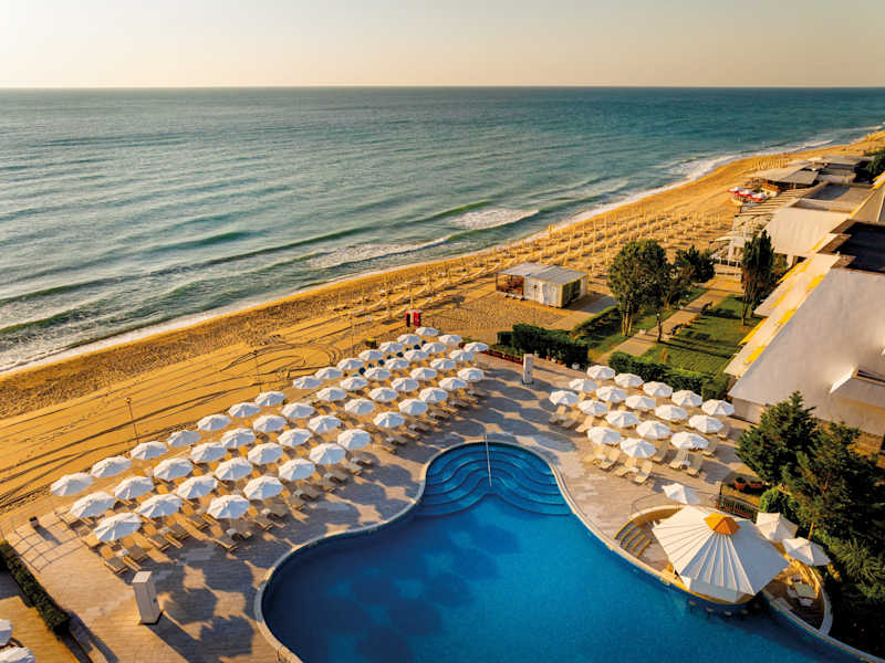 Das Hotel in Obzor ist ein ideales Reiseziel für Familien, die in direkter Strandlage entspannen möchten. Von der Terrasse des Pools können Sie zauberhafte Sonnenuntergänge genießen und das All-Inclusive-Angebot des Hotels bietet eine große Auswahl an kulinarischen Köstlichkeiten.