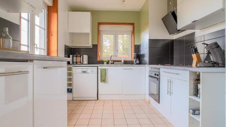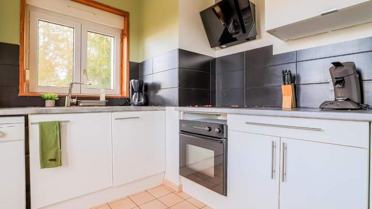 Das Ferienhaus bietet eine voll ausgestattete Küche, die mit einem Kühlschrank und einer Kaffeemaschine ausgestattet ist. Zudem gibt es zwei Badezimmer, die mit einer Dusche und einem Haartrockner ausgestattet sind. Die Einrichtung umfasst insgesamt vier Schlafzimmer und ein Wohnzimmer.