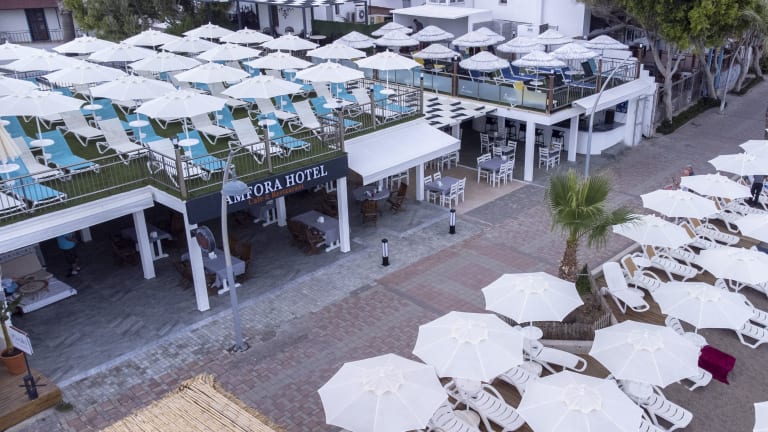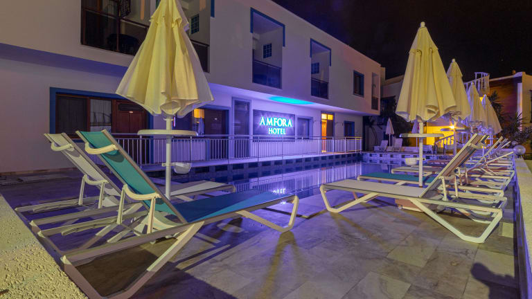 Das Amfora Hotel bietet Übernachtungsmöglichkeiten in einem Garten mit einem kostenlosen Privatparkplatz und einem eigenen Strandbereich. Zu den Einrichtungen zählen ein Restaurant, Zimmerservice sowie eine 24-Stunden-Rezeption. Die Unterkunft umfasst zudem einen Außenpool und ein Unterhaltungsprogramm am Abend. WLAN ist in allen Bereichen kostenfrei verfügbar.