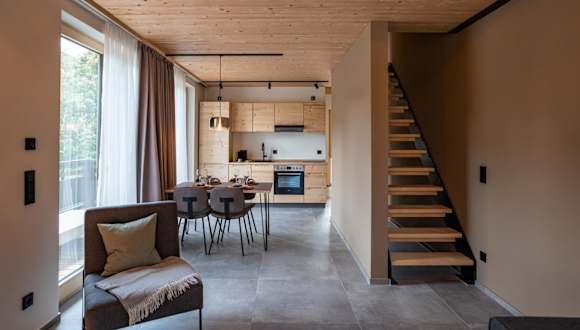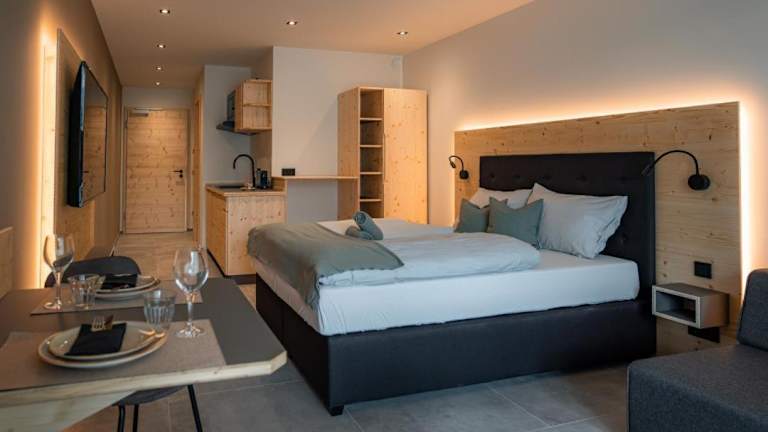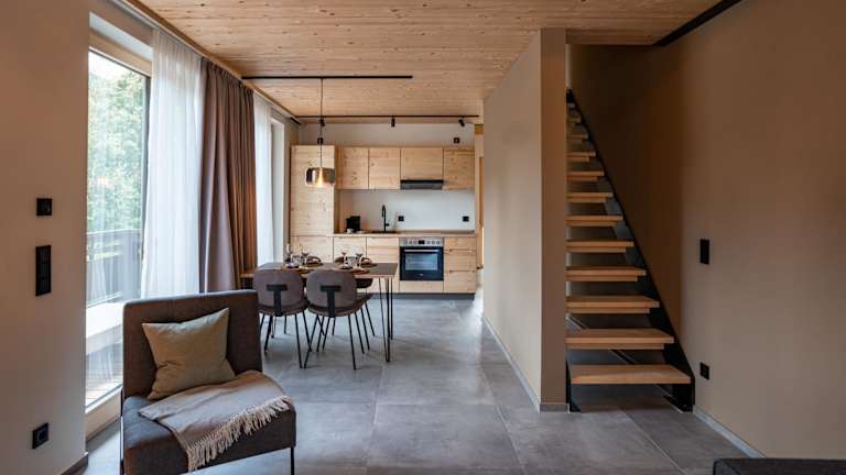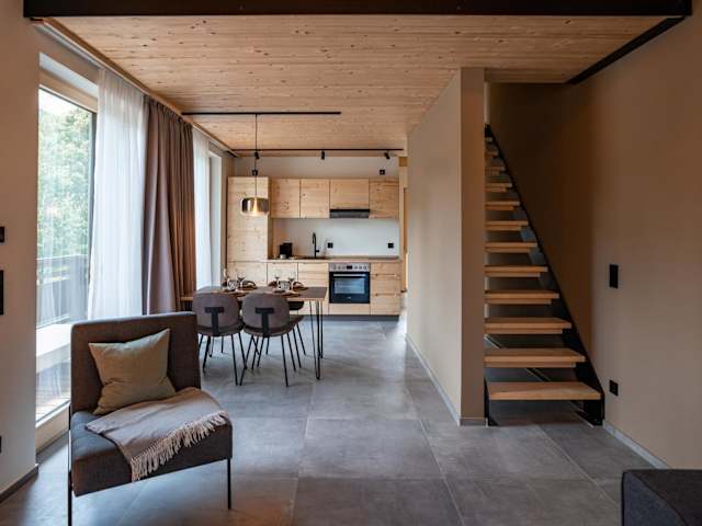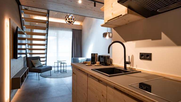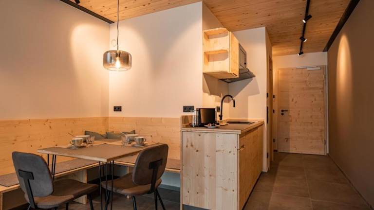 In jeder Wohneinheit gibt es eine voll ausgestattete Küchenzeile, die mit einem Kühlschrank, Geschirrspüler, Toaster, Kaffeemaschine und Wasserkocher eingerichtet ist. Ein Esstisch ist ebenfalls vorhanden.