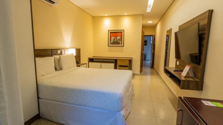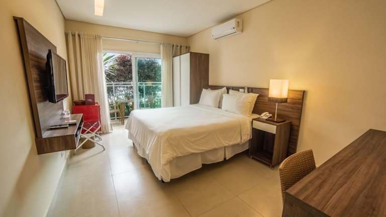 Die in neutralen Farben gestalteten Zimmer des Amora Hotel Maresias sind komfortabel eingerichtet und verfügen über Klimaanlage, einen 39-Zoll-LED-Fernseher mit Kabelkanälen und einem Blu-ray-Player, einen Safe, eine Minibar, ein Telefon sowie ein eigenes Bad mit Haartrockner.