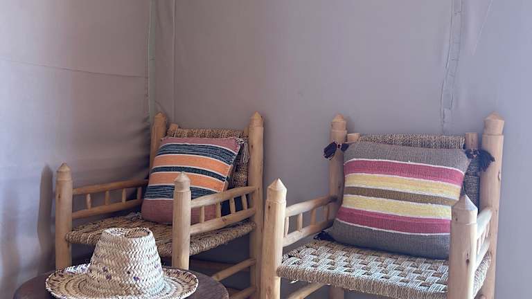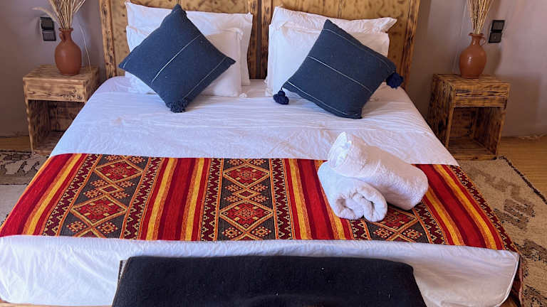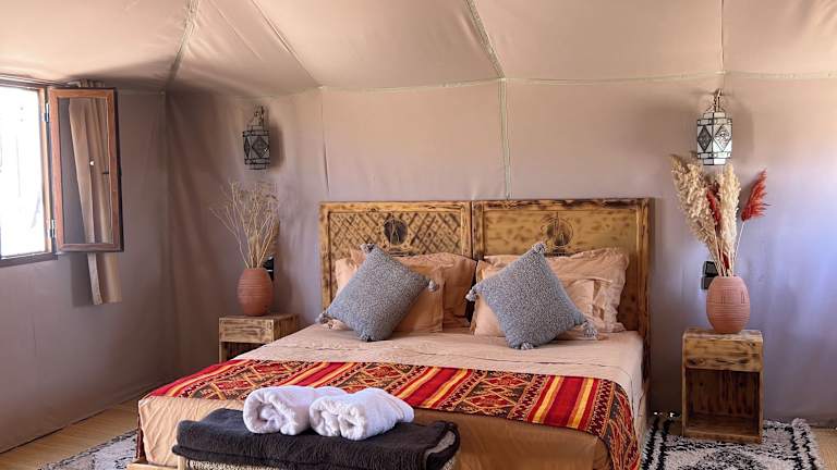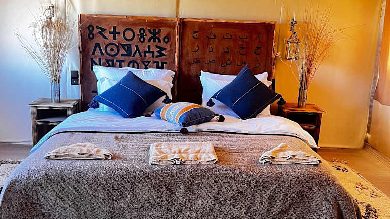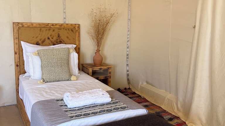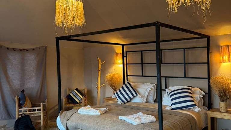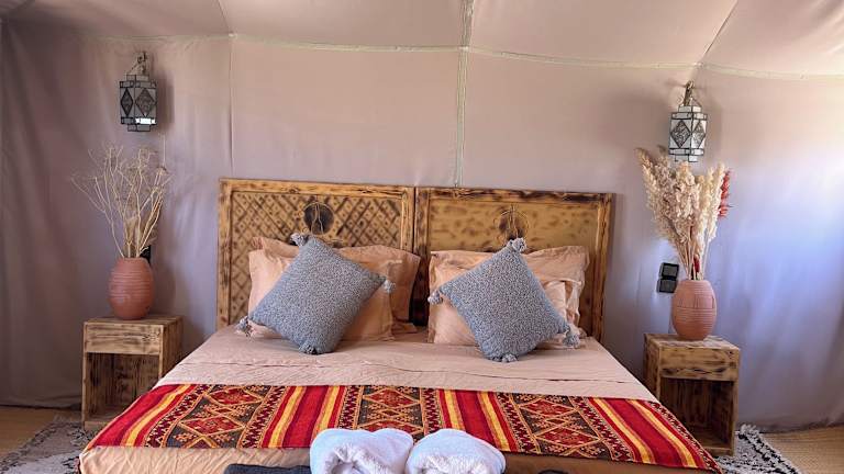 Die luxuriösen Zelte im Amskou Camp bieten Ihnen einen komfortablen Aufenthalt inmitten der Natur. Jedes Zelt ist voll ausgestattet und verfügt über ein eigenes Bad mit Bidet und Hausschuhen. Hier können Sie sich wie zu Hause fühlen und dennoch den einzigartigen Charme des Camps genießen.