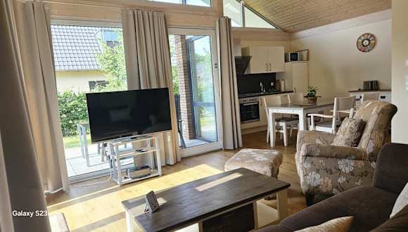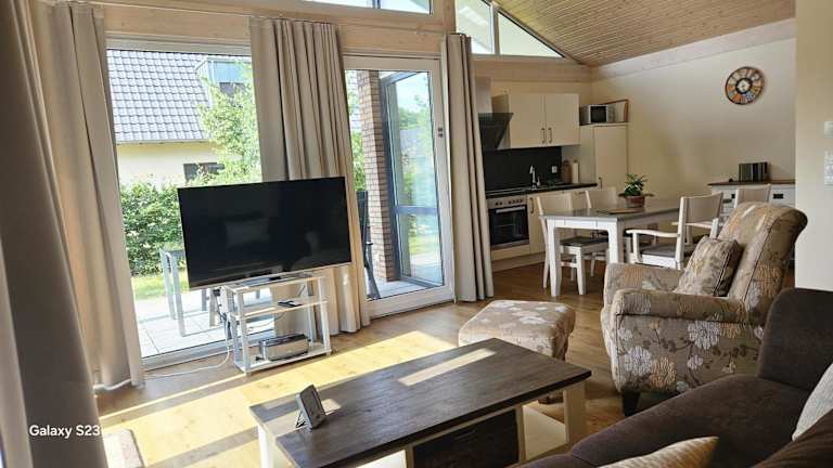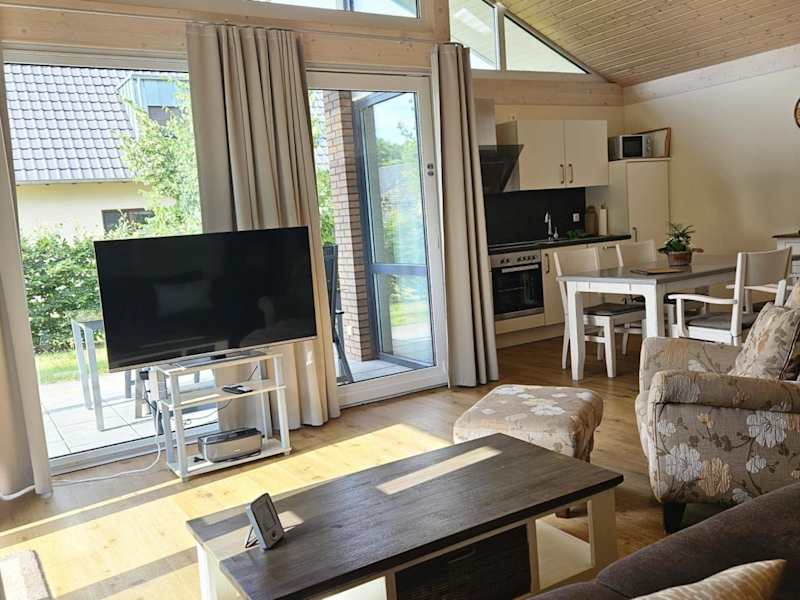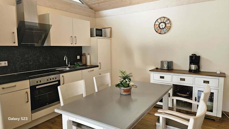 Die Unterkunft beinhaltet einen Essbereich sowie eine voll ausgestattete Küche, die mit einem Kühlschrank, einem Geschirrspüler und einem Ofen ausgestattet ist.