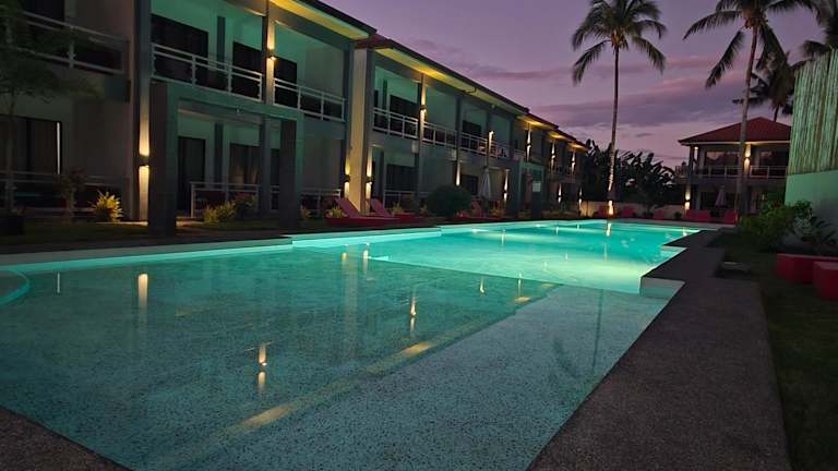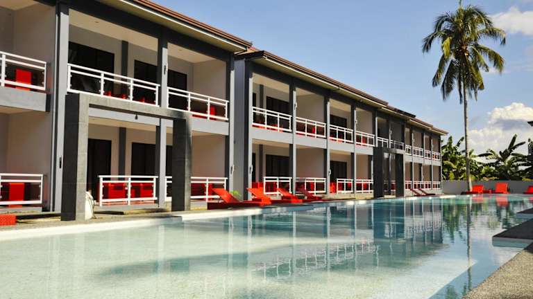 Zimmer sind zwar einfach ausgestattet, aber dafür sauber und groß mit Blick auf den schönen großen Pool. Abends, wenn alle von den Ausflügen oder Strand zurückkommen, kann es am Pool schon mal lauter zugehen
