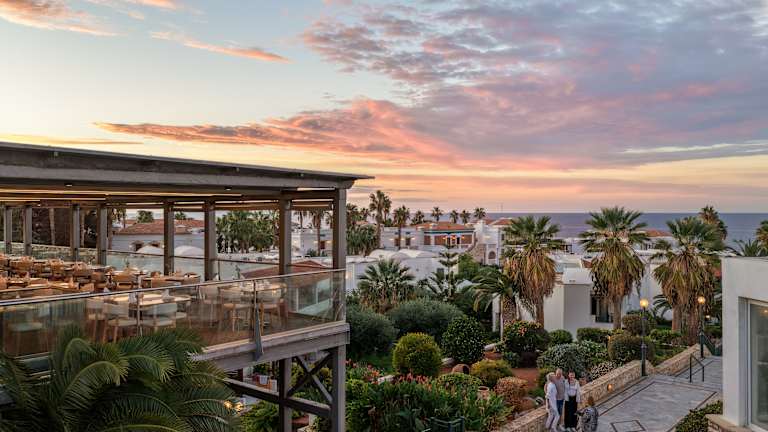 Restaurants Ambrosia Das Hauptrestaurant „Ambrosia” ist ein klimatisiertes Buffet-Restaurant mit Panoramablick über das Mittelmeer. Reichhaltiges Frühstücksbuffet 07.15 - 10.00 Uhr Mittagsbuffet 12.30 – 14.00 Uhr Abendbuffet 18.30 – 21.30 mit Showkochen Drei Themen-Abendbuffets pro Woche. Griechisch, Mittelmeer, Italienische Gala (erste Woche) Schwarz-und-Weiß-Gala, Bufett mit internationalen Spezialitäten, Kretischer Abend (zweite Woche) Kinderbuffet zum Abendessen 20. Mai – 30. September. Athena À-la-carte Restaurant in der Taverne „Athena” am Strand Öffnungszeiten: 10:00 – 17:00: Warme und kalte Snacks 11.00 – 17.00 Uhr (Selbstbedienung). Kaffeestunde: 16.00 -17.00 Uhr: Filterkaffee, Espresso, Cappuccino, griechischer Kaffee, Tee, Kekse und Kuchen. Öffnungszeiten: 19.30 – 21.15 Uhr (ab erste Juniwoche bis 30. September fünf Tage die Woche) Abendessen à-la-carte mit griechischem Menü, italienischem Menü oder Fischabend. Tischreservierung empfohlen, angemessene Abendkleidung erforderlich.