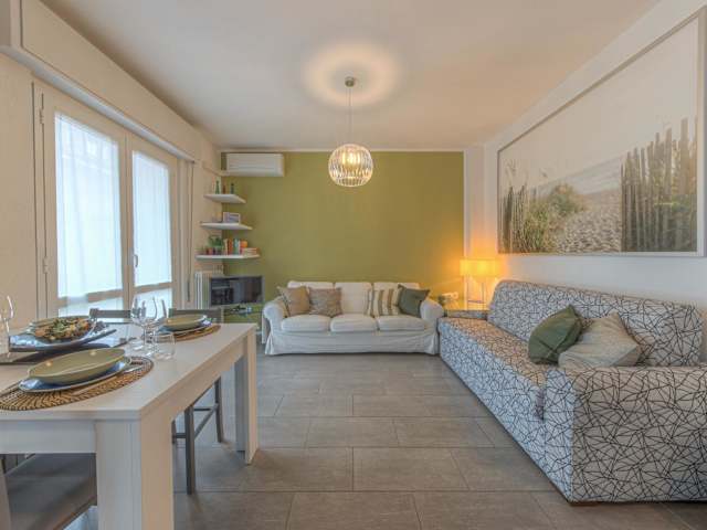 Die Ferienwohnung besteht aus zwei Schlafzimmern, einem Wohnzimmer und einer voll ausgestatteten Küche einschließlich Kühlschrank und Wasserkocher. Zudem verfügt die Unterkunft über zwei Badezimmer mit Bidet und Dusche. Handtücher und Bettwäsche werden bereitgestellt.