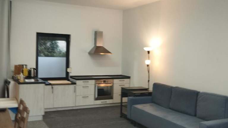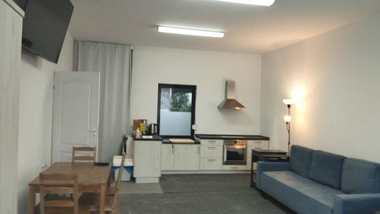 Die Ferienwohnung bietet ein Schlafzimmer und eine Küchenzeile, die mit einem Kühlschrank und einem Ofen ausgestattet ist. Das Badezimmer verfügt über eine Dusche, einen Haartrockner und eine Waschmaschine. Handtücher und Bettwäsche werden zur Verfügung gestellt.