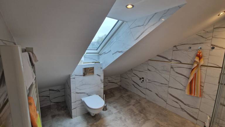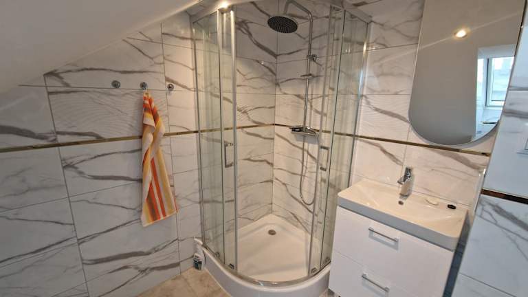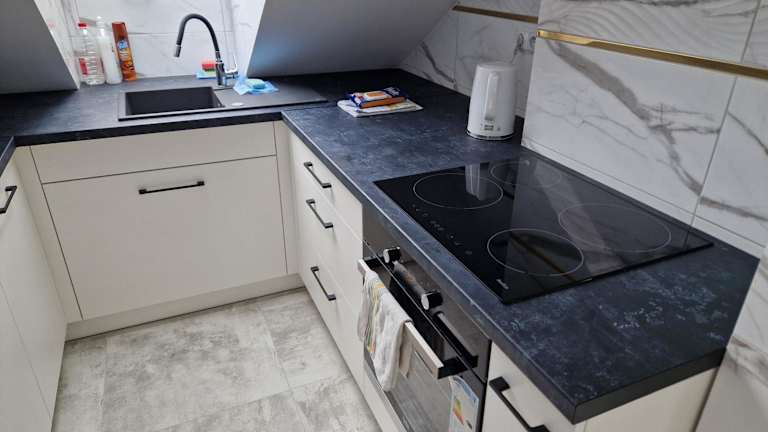 Die Ferienwohnung beinhaltet ein Schlafzimmer, eine Küchenzeile mit Kühlschrank und Geschirrspüler, einen Flachbild-TV, einen Sitzbereich sowie ein Badezimmer mit Dusche.