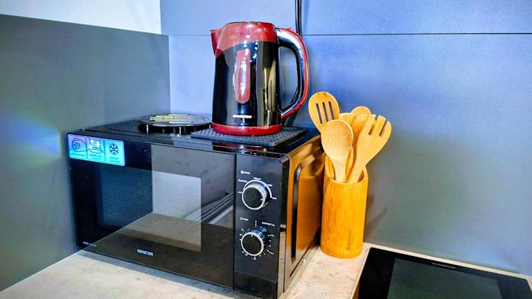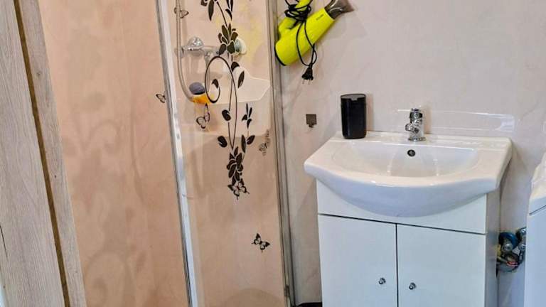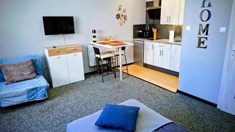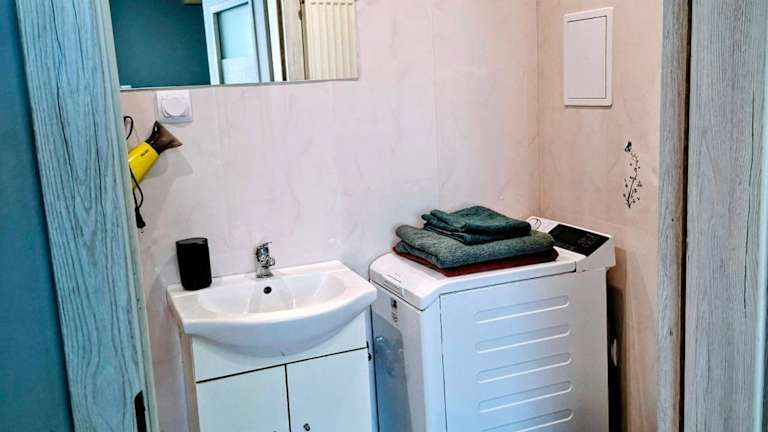 Die Ferienwohnung bietet 1 Schlafzimmer, eine Küchenzeile mit Kühlschrank und Mikrowelle sowie ein Badezimmer mit Dusche, Haartrockner und Waschmaschine. Handtücher und Bettwäsche werden bereitgestellt.