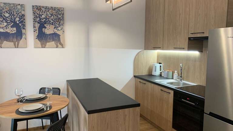 Die Ferienwohnung verfügt über 1 Schlafzimmer, ein Wohnzimmer, eine voll ausgestattete Küchenzeile mit Geschirrspüler und Wasserkocher sowie ein Badezimmer mit Dusche und Haartrockner. Ein Flachbild-TV ist ebenfalls vorhanden.