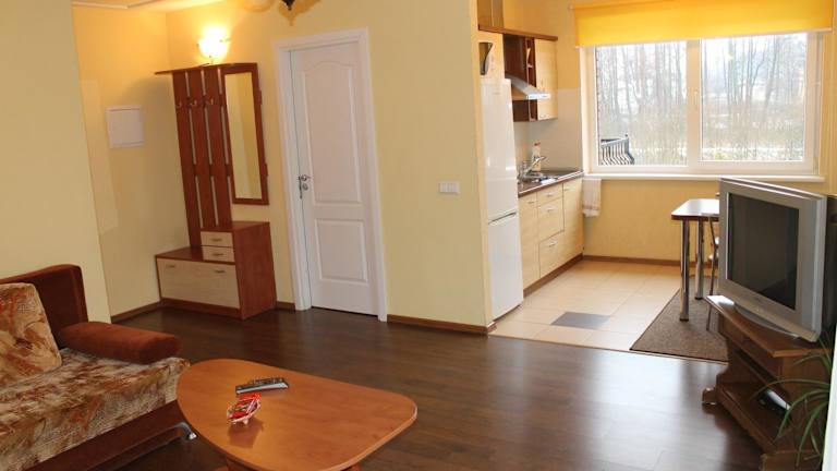 Die Apartments im Apartamentai Pluke sind klassisch eingerichtet und bieten Ihnen eine gemütliche Atmosphäre. Jedes Apartment verfügt über eine Terrasse, auf der Sie die frische Luft und die Aussicht genießen können. Der Sitzbereich lädt zum Entspannen ein und der Flachbild-TV sorgt für Unterhaltung. Die Küche ist komplett ausgestattet mit einer Mikrowelle und einem Kühlschrank, so dass Sie Ihre eigenen Mahlzeiten zubereiten können. Im eigenen Bad finden Sie eine Badewanne oder eine Dusche sowie Handtücher vor. Einige Apartments verfügen sogar über einen Kamin, der für eine zusätzliche Gemütlichkeit sorgt.