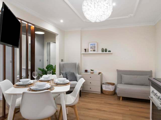Die Wohnung umfasst zwei Schlafzimmer und ein Badezimmer. Zur Ausstattung gehören Bettwäsche, Handtücher, ein TV mit Kabelkanälen sowie eine voll ausgestattete Küche. Ein Balkon mit Meerblick ist ebenfalls vorhanden.