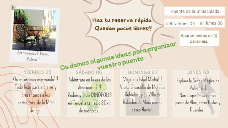 Die Apartamentos El Prado befinden sich in der Region Aragonien in Valbona, 118 km vom nächstgelegenen Flughafen Valencia entfernt. Die Umgebung bietet Möglichkeiten zur Erkundung von Wanderrouten und Skigebieten.