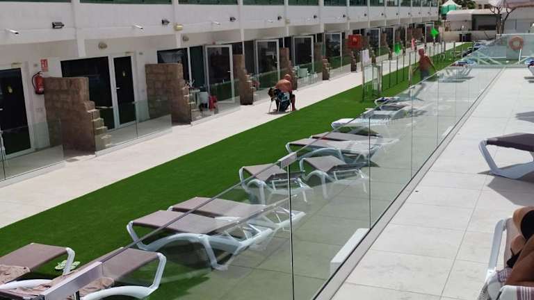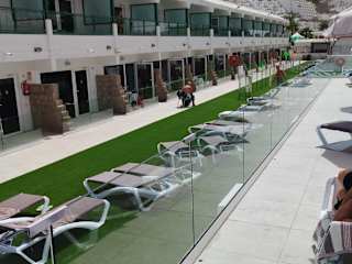 Der Pool der Apartamentos Florida Gran Canaria wird mit Sonnenkollektoren beheizt und bietet eine angenehme Möglichkeit, sich zu erfrischen und zu entspannen. Neben dem Pool gibt es zwei große Terrassen mit Liegestühlen und Sonnenschirmen, auf denen Sie die Sonne Gran Canarias genießen können. Der Strand ist ebenfalls in der Nähe und lädt zu Wassersportaktivitäten und Spaziergängen am Meer ein.