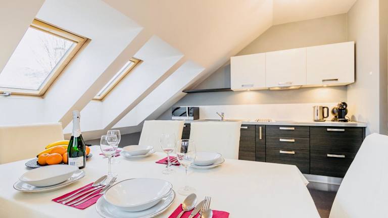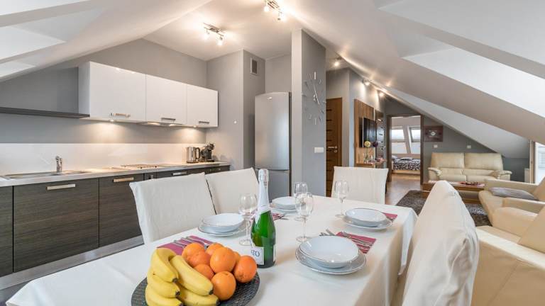 Apartamenty Smile bietet Übernachtungsmöglichkeiten mit Poolblick und ist ausgestattet mit einem Balkon. Die Unterkunft verfügt über 3 Schlafzimmer, 1 Badezimmer, Bettwäsche, Handtücher, einen Flachbild-TV mit Kabelkanälen, einen Essbereich sowie eine voll ausgestattete Küche. Die Terrasse bietet einen Blick auf die Berge.