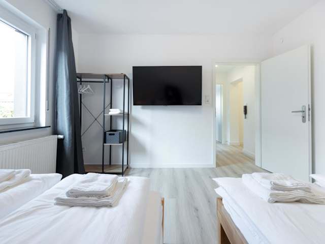 Das Apartement umfasst 1 Schlafzimmer, eine Küche mit Ofen und Herdplatte sowie ein Badezimmer mit Dusche, Haartrockner und Waschmaschine. Handtücher und Bettwäsche werden bereitgestellt. Die Unterkunft ist rauchfrei und es gibt getrennte Bereiche für Nichtraucher. Die Reinigung der Unterkunft erfolgt durch professionelle Reinigungsfirmen, und die Wäsche wird nach den Richtlinien der örtlichen Behörden gewaschen.