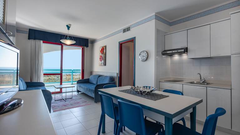 Die Ferienwohnungen im Aparthotel Imperial vereinen Komfort, Funktionalität und Großzügigkeit – ideal für einen unbeschwerten Familienurlaub direkt am Meer. Alle Apartments sind klimatisiert und verfügen über ein modernes Küchenmodul, SAT-LCD-TV, Safe, kostenfreies WLAN, Bad mit Dusche und Haartrockner sowie einen möblierten Balkon – größtenteils mit seitlichem oder direktem Meerblick. Der tägliche Reinigungs- und Wäschewechsel sowie Pooltücher sind im Aufenthalt inbegriffen. Familien mit kleinen Kindern profitieren von zahlreichen kindgerechten Extras: Auf Wunsch stellen wir Babybetten, Hochstühle, Wickelauflagen, Badewannen, Flaschenwärmer, Töpfchen, WC-Aufsätze, Windeleimer und vieles mehr bereit – ohne Aufpreis. Wählen Sie zwischen zwei Apartmenttypen: Family Panoramic (3-Zimmer-Wohnung | max. 6 Personen) Ideal für größere Familien, mit zwei separaten Schlafzimmern, hellem Wohnbereich mit zwei Einzel-Schlafsofas, voll ausgestatteter Küche mit Mikrowelle und großem Panoramabalkon mit Meerblick und Sonnenliegen. Family Suite (2-Zimmer-Wohnung | max. 4 Personen) Optimal für Paare oder kleinere Familien: Wohnbereich mit Doppel-Schlafsofa, Schlafzimmer mit zusätzlichem Schlafsessel oder Einzelbett, Küchenzeile und überdachtem Balkon, größtenteils mit seitlichem Meerblick. Hochwertige Materialien, elegante Keramikböden und eine warme, familienfreundliche Atmosphäre machen das Aparthotel Imperial zu einem Ort, an dem Sie sich sofort wie zuhause fühlen – mit dem Meer direkt vor der Tür.