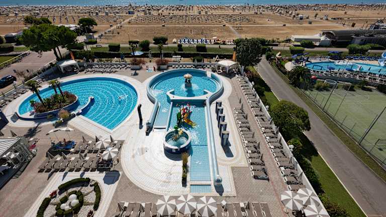 Das Aparthotel Imperial ist wie geschaffen für einen unvergesslichen Familienurlaub in Bibione. Drei großzügige Außenpools mit unterschiedlichen Tiefen bieten Erfrischung und Badespaß für Groß und Klein – von flachen Kinderbecken mit fantasievollen Wasserspielen bis hin zu Relax-Bereichen mit Hydromassage. Direkt vor dem Hotel erwartet Sie ein komplett neu gestalteter, privater Strandabschnitt: Großzügig platzierte Sonnenschirme mit XL-Liegen, elegante Gazebos mit Relaxsesseln, schattige Spielbereiche für Kinder und bequeme Holzstege – ideal auch für Kinderwagen. Für noch mehr Komfort: kostenlose Leihfahrräder mit Kindersitzen und Helmen, Baby- und Kinderbetreuung im Mini- und Babyclub, Animation für verschiedene Altersgruppen sowie ein komplett ausgestatteter Indoor-Spielbereich mit über 400 m² Spielfläche, Videospielen, Playstation und Leseecke. Zusätzliche Annehmlichkeiten wie Münzwaschmaschinen, Trockner, ein Fitnessbereich sowie ein rauchfreier Poolbereich mit Snackbar runden das Angebot ab – für entspannte Urlaubstage mit der ganzen Familie.