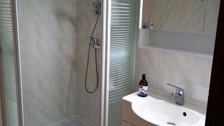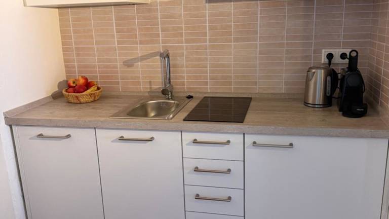 Die Ferienwohnung ist ausgestattet mit einem Flachbild-TV und einer Küche, die über einen Kühlschrank, einen Ofen, eine Herdplatte, eine Kaffeemaschine und einen Wasserkocher verfügt.