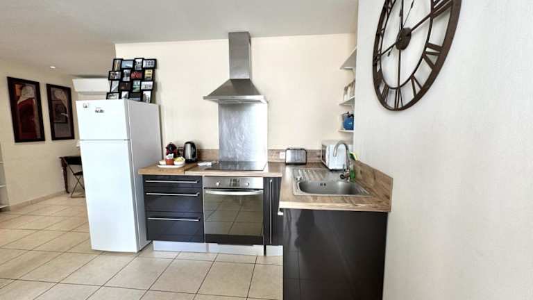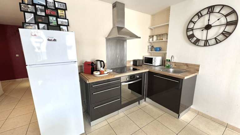 In der Ferienwohnung gibt es eine voll ausgestattete Küche mit einem Kühlschrank, einem Ofen, einer Mikrowelle und einer Kaffeemaschine, die es Gästen ermöglicht, ihre eigenen Mahlzeiten zuzubereiten.