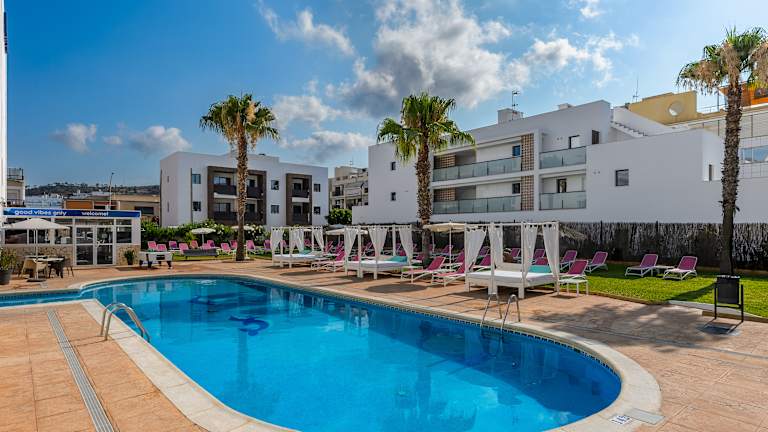 Im Vibra Central City Aparthotel steht Ihnen eine neue Snackbar im Poolbereich zur Verfügung, wo Sie Energie tanken können. Probieren Sie die köstlichen Gerichte auf unserer Speisekarte. Darauf sind so beliebte Speisen wie unser Ibiza Club Sandwich, XXL Toastie oder unser Klassiker - der Beef Burger (180 g) - zu finden. Darüber hinaus können Sie auch leckere Pizzen, Salate und Specials wie Nachos oder BBQ Ribs probieren. Lassen Sie Ihre Seele am Swimmingpool baumeln... Wir kümmern uns um den Rest!