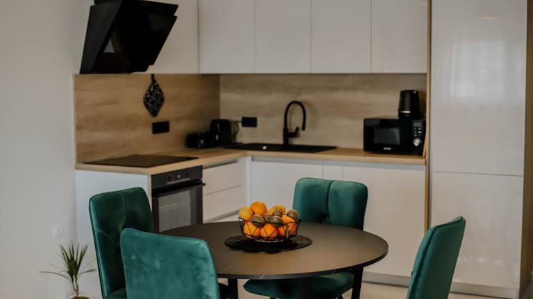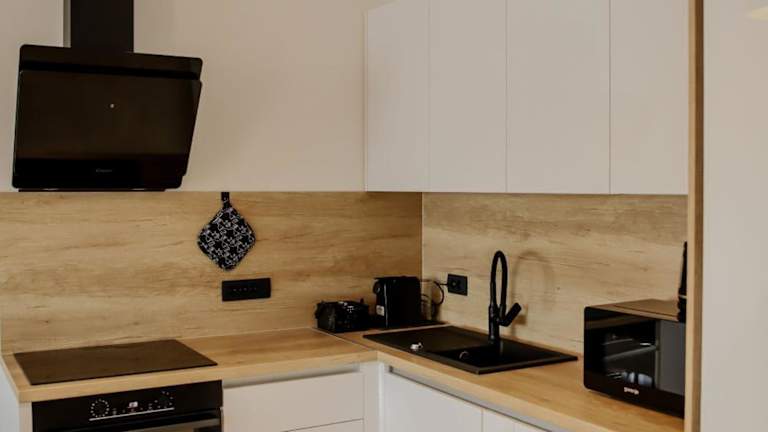 Die voll ausgestattete Küche der Ferienwohnung ermöglicht die Zubereitung eigener Mahlzeiten. Ein Wasserkocher, ein Kühlschrank und eine Kaffeemaschine stehen zur Verfügung.