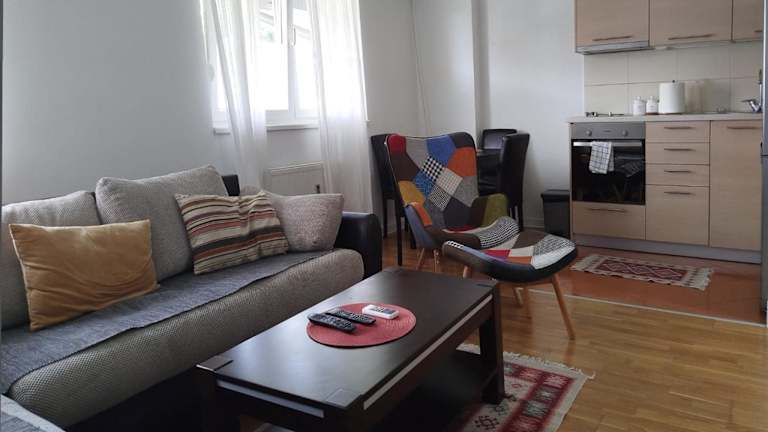 Das Sweet apartment near the city centar with garage bietet eine Ferienwohnung mit Veranda/Patio, kostenfreiem Privatparkplatz und kostenlosem WLAN. Die Wohnung ist klimatisiert und bietet modernen Komfort.