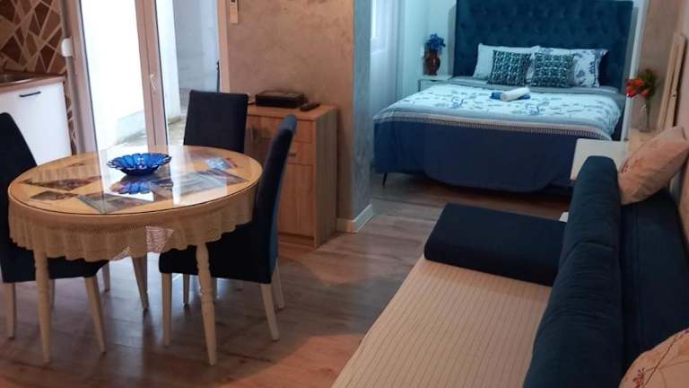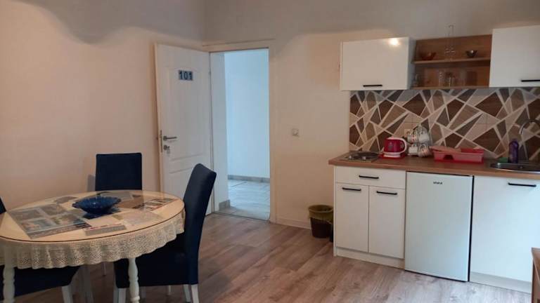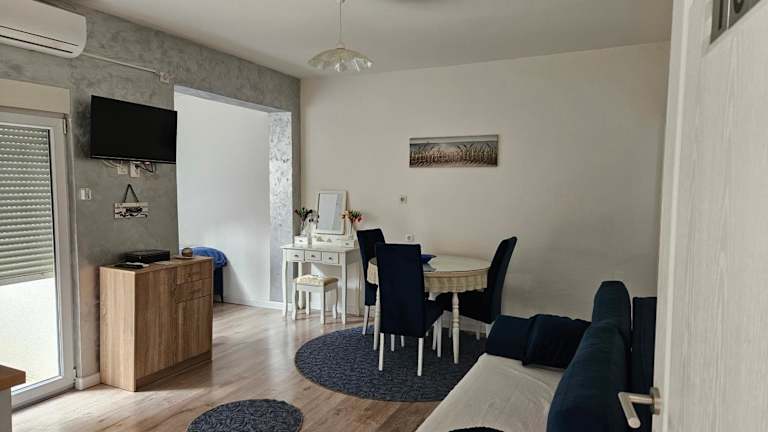 Das klimatisierte Apartment im Apartman NENA 101 bietet Platz für bis zu vier Personen. Mit zwei separaten Schlafzimmern und einer voll ausgestatteten Küche bietet es ausreichend Platz und Komfort für einen längeren Aufenthalt. Ein Flachbild-TV sorgt für Unterhaltung und der direkte Zugang zur Terrasse lädt zum Entspannen ein.
