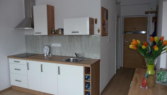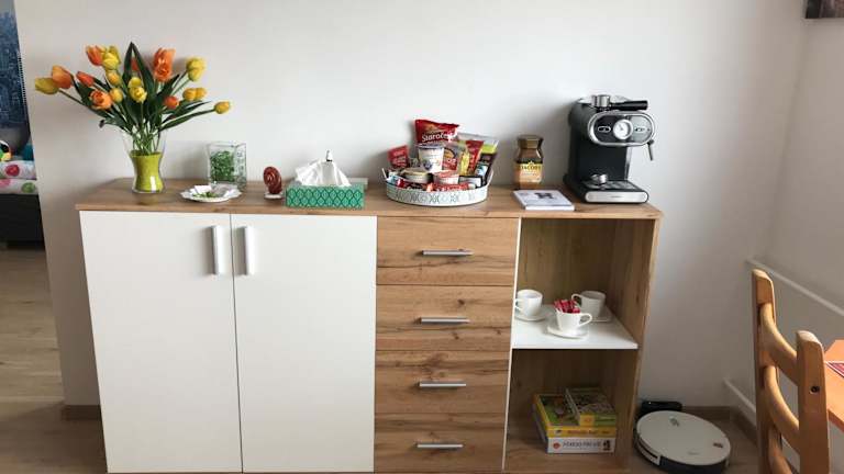Das Apartment besteht aus einem Schlafzimmer, einem Wohnzimmer und einer voll ausgestatteten Küche. Gäste können sich in der Küche bequem Mahlzeiten zubereiten, da sie mit einem Kühlschrank und einer Kaffeemaschine ausgestattet ist. Das Apartment verfügt auch über ein Badezimmer mit einer Dusche und kostenlosen Pflegeprodukten. Handtücher und Bettwäsche werden gestellt, um den Gästen einen angenehmen Aufenthalt zu ermöglichen.