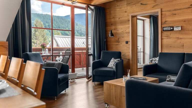 Die Unterkünfte verfügen über einen Balkon mit Bergblick, einen Sitzbereich, einen Flachbild-TV, sowie eine voll ausgestattete Küchenzeile mit Kühlschrank, Geschirrspüler, Ofen, Mikrowelle, Herdplatte, Kaffeemaschine und Wasserkocher. Zudem sind die Zimmer mit einem eigenen Badezimmer mit Dusche und Haartrockner ausgestattet.