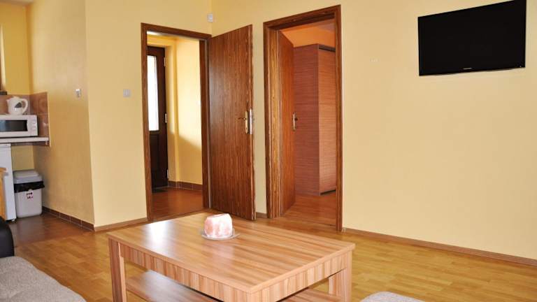 Das Apartment im Apartmány Forró verfügt über eine Terrasse und einen gemütlichen Sitzbereich. Es gibt auch einen Flachbild-Sat-TV für Unterhaltung. Die voll ausgestattete Küchenzeile bietet alles, was man für die Zubereitung von Mahlzeiten benötigt, einschließlich Kühlschrank, Mikrowelle, Kochfeld und Wasserkocher. Das private Badezimmer ist mit einer Dusche und kostenlosen Pflegeprodukten ausgestattet.