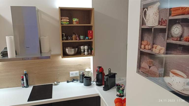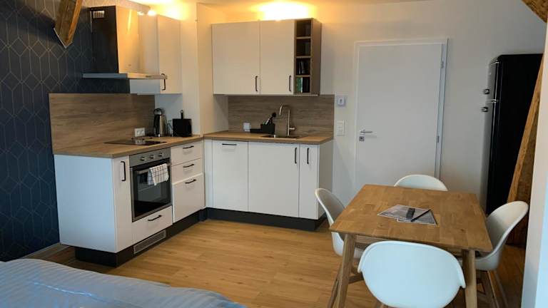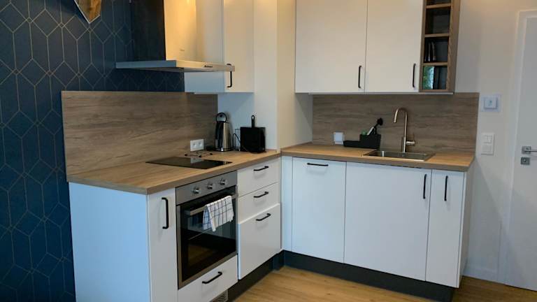 Die Unterkunft verfügt über eine Küche, die mit einem Kühlschrank, Geschirrspüler, Ofen und Kaffeemaschine ausgestattet ist.