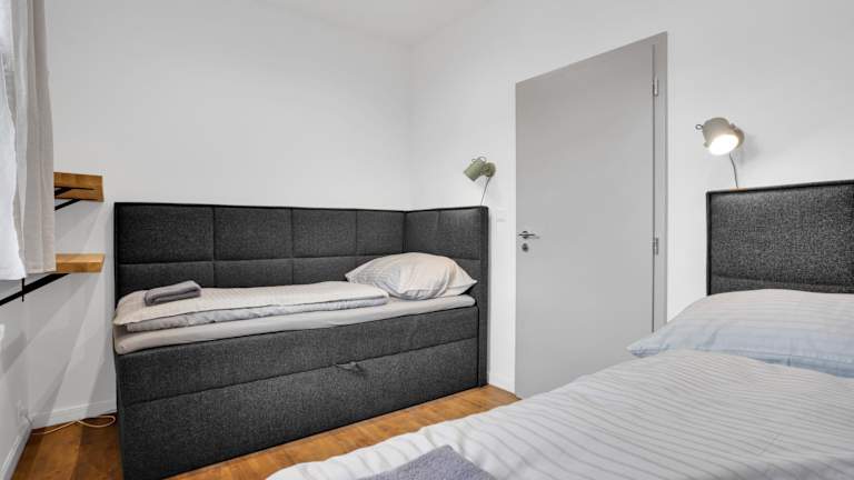 Die Ferienwohnung bietet 2 Schlafzimmer, eine gut ausgestattete Küche mit Kühlschrank und Geschirrspüler, einen Flachbild-TV, einen Sitzbereich sowie ein Badezimmer mit Dusche. Handtücher und Bettwäsche werden bereitgestellt.