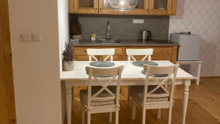 In den Apartments steht eine Küchenzeile zur Verfügung, die mit einem Kühlschrank, einer Herdplatte und einem Wasserkocher ausgestattet ist. Ein Esstisch ist ebenfalls vorhanden, um die Mahlzeiten bequem einzunehmen.