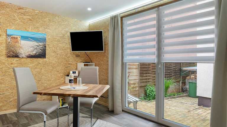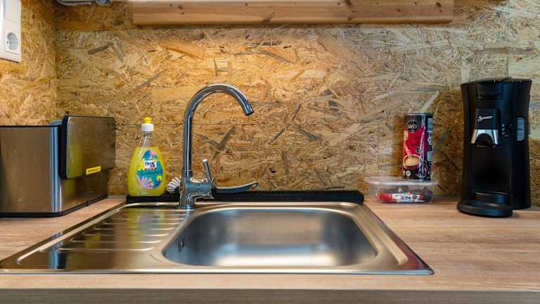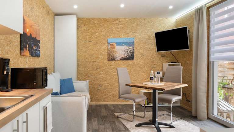 Die Ferienwohnung ist mit einer voll ausgestatteten Küche versehen, in der sowohl ein Kühlschrank als auch eine Mikrowelle, eine Kaffeemaschine und ein Wasserkocher zur Verfügung stehen.