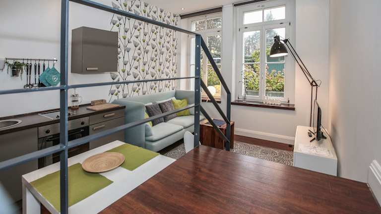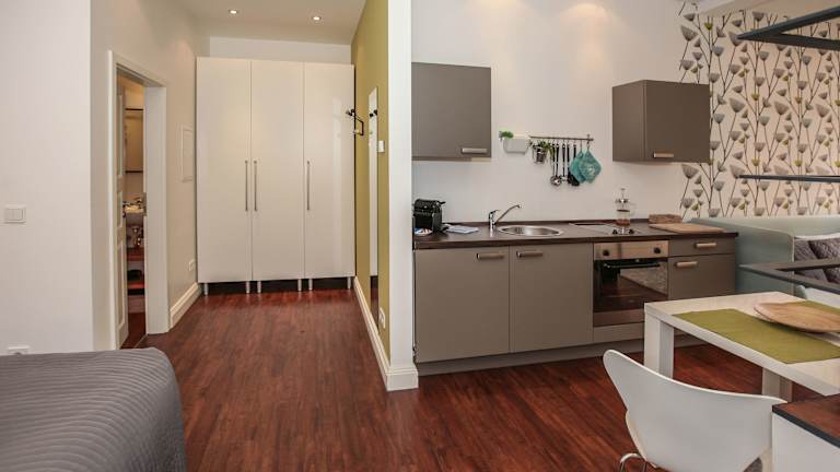 In der Nähe des Apartments finden Sie eine Auswahl an Restaurants und Cafés, in denen Sie lokale und internationale Küche genießen können. Nach einem 15-minütigen Spaziergang erreichen Sie bequem verschiedene gastronomische Einrichtungen. Für Gäste, die lieber selbst kochen möchten, bietet die voll ausgestattete Küchenzeile im Apartment alle notwendigen Annehmlichkeiten. Supermärkte sind ebenfalls in der Nähe, so dass Sie problemlos Ihre Einkäufe erledigen können.