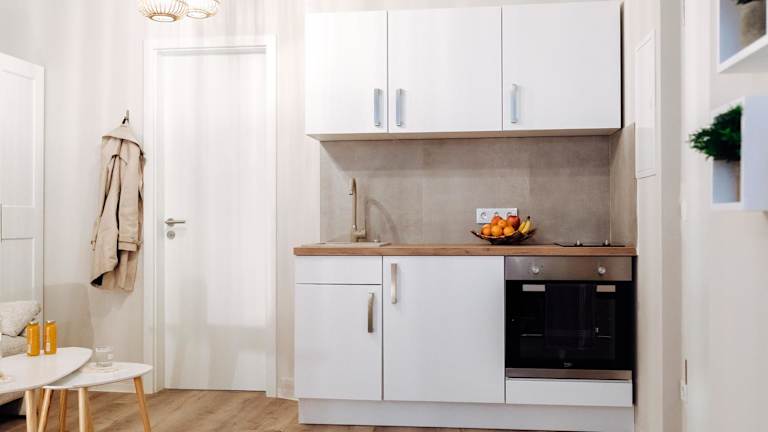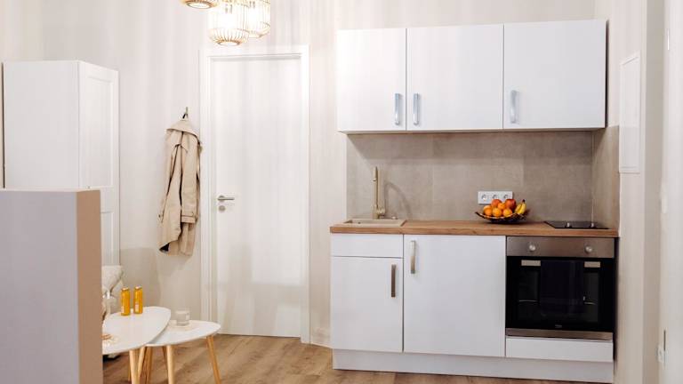 Essenslieferung in die Unterkunft ist möglich. Die voll ausgestattete Küche der Ferienwohnung ermöglicht es Gästen, eigenständig Mahlzeiten zuzubereiten.
